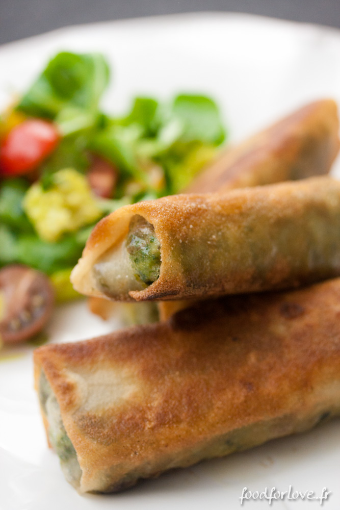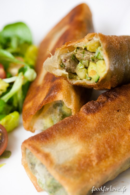 Versez une à deux cuillères à soupe de préparation dans chaque feuille de brick et roulez comme un nem. Vous pouvez aussi le présenter en samoussas si vous préférez.