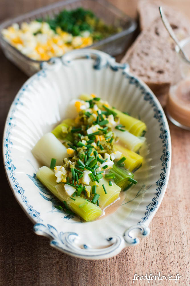 Aujourd'hui, rassurez-vous, j'ai tué des poireaux. Je les ai agrémenté d'une vinaigrette assez classique, avec de l’œuf dur, des cornichons hachés et de la ciboulette. Rajoutez-y des câpres et de l'estragon et vous aurez une VRAIE gribiche. Je tremble. C'est bien ça, hein ?