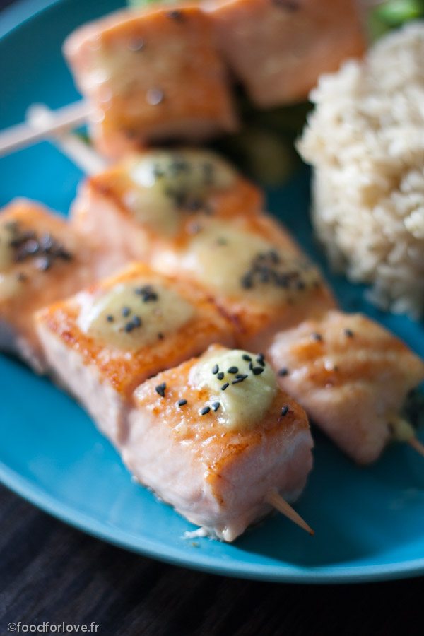 Déposez les brochettes dans les assiettes, recouvrez de peluches de beurre au wasabi et parsemez de sésame noir.
